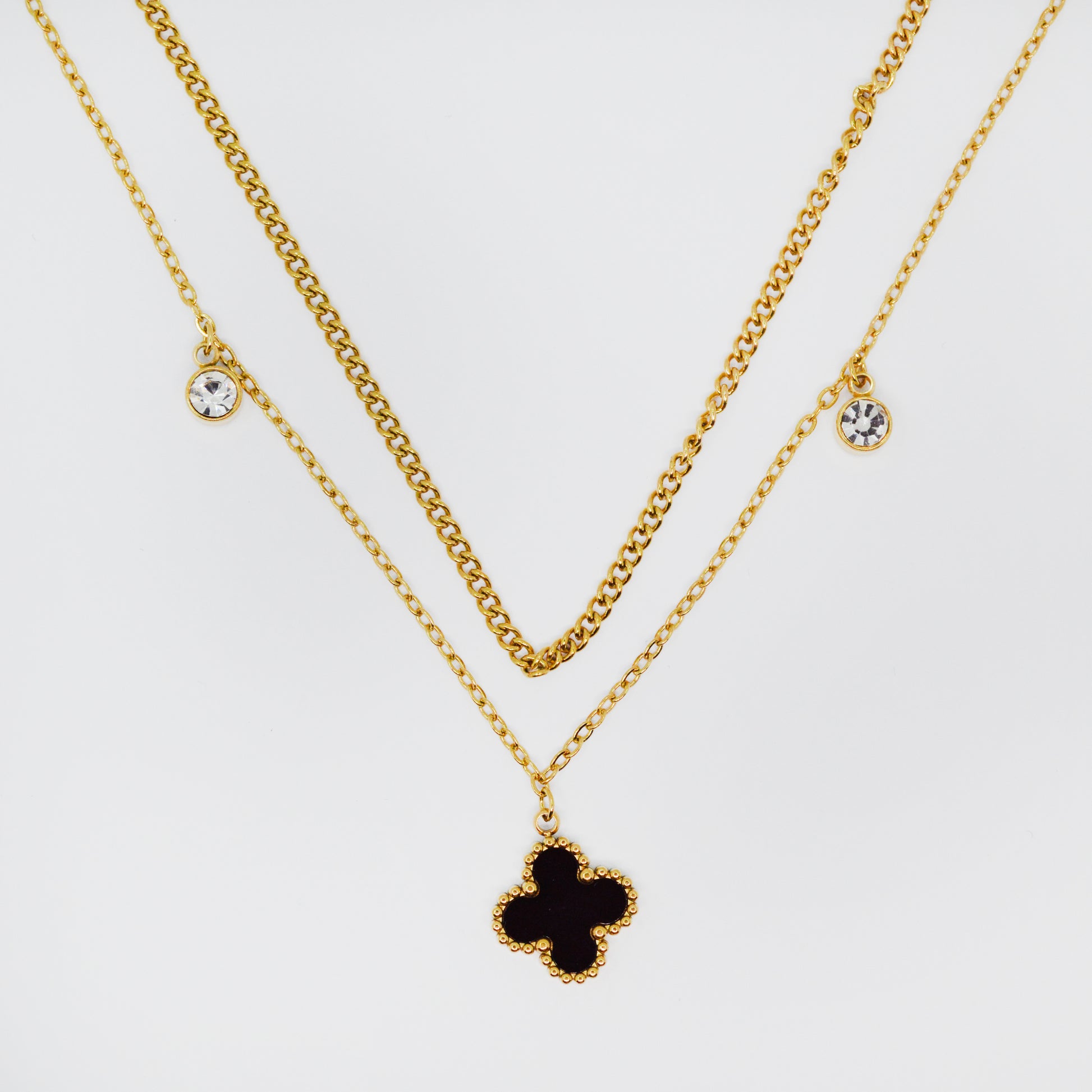 Multi-layered stainless steel necklace with a dangling black clover and subtle zircons. Available in elegant silver and gold.
